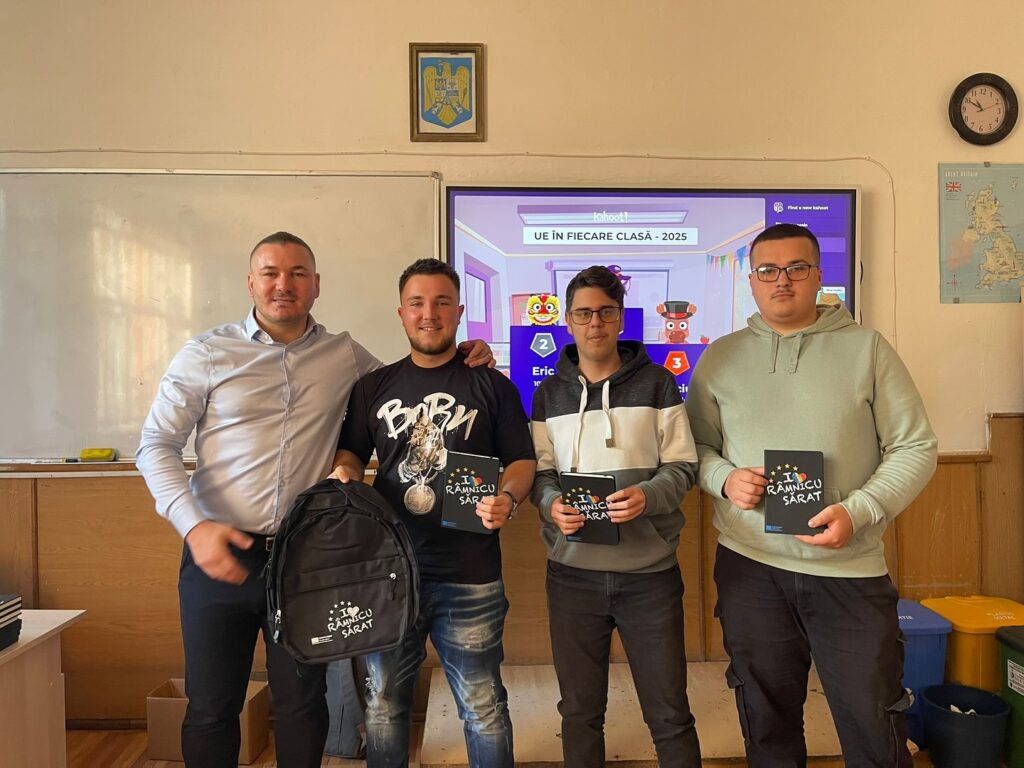 Din fotografiile de la activitate se vede clar că discuția nu a fost una „rece”. Într-una dintre imagini, în fața clasei stau facilitatori, iar pe masă sunt materiale cu simboluri europene și cu numele orașului, semn că întâlnirea a avut și o componentă de identitate locală: Europa nu e doar „acolo”, ci și aici, în comunitatea ta. În alt cadru, pe ecran apare un joc interactiv tip Kahoot cu titlul „UE în fiecare clasă – 2025”, iar detaliul acesta spune multe despre stilul întâlnirii: când tinerii sunt implicați activ, informația nu mai e ceva ce „primești”, ci ceva cu care te joci, pe care o testezi, o întorci pe toate fețele și o ții minte.