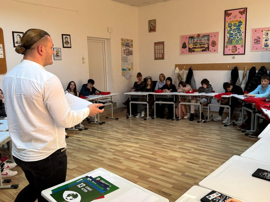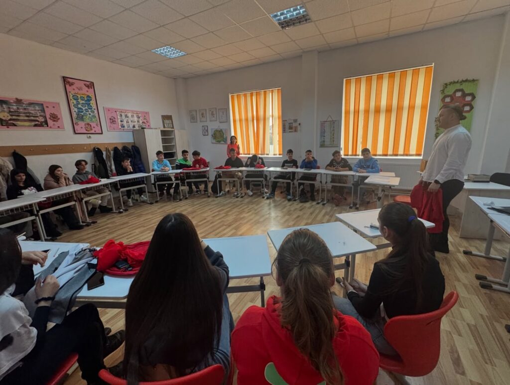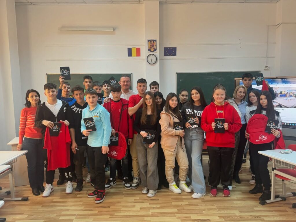 În fotografia de grup se vede exact energia unei întâlniri reușite: elevi care stau aproape, zâmbesc, țin în mână materiale și premii, iar în jurul lor sunt profesori și facilitatori care nu par „în vizită”, ci parte din același moment. Într-o altă imagine, sala este aranjată în semicerc, ceea ce schimbă complet dinamica față de orele clasice: nu mai există doar „un vorbitor” și „cei care ascultă”, ci un spațiu în care privirile se întâlnesc și în care discuția poate deveni vie. Și chiar dacă pare un detaliu mic, felul în care stau oamenii într-o încăpere spune mult despre felul în care se simt: în siguranță să întrebe, încurajați să participe, respectați ca parteneri de dialog.