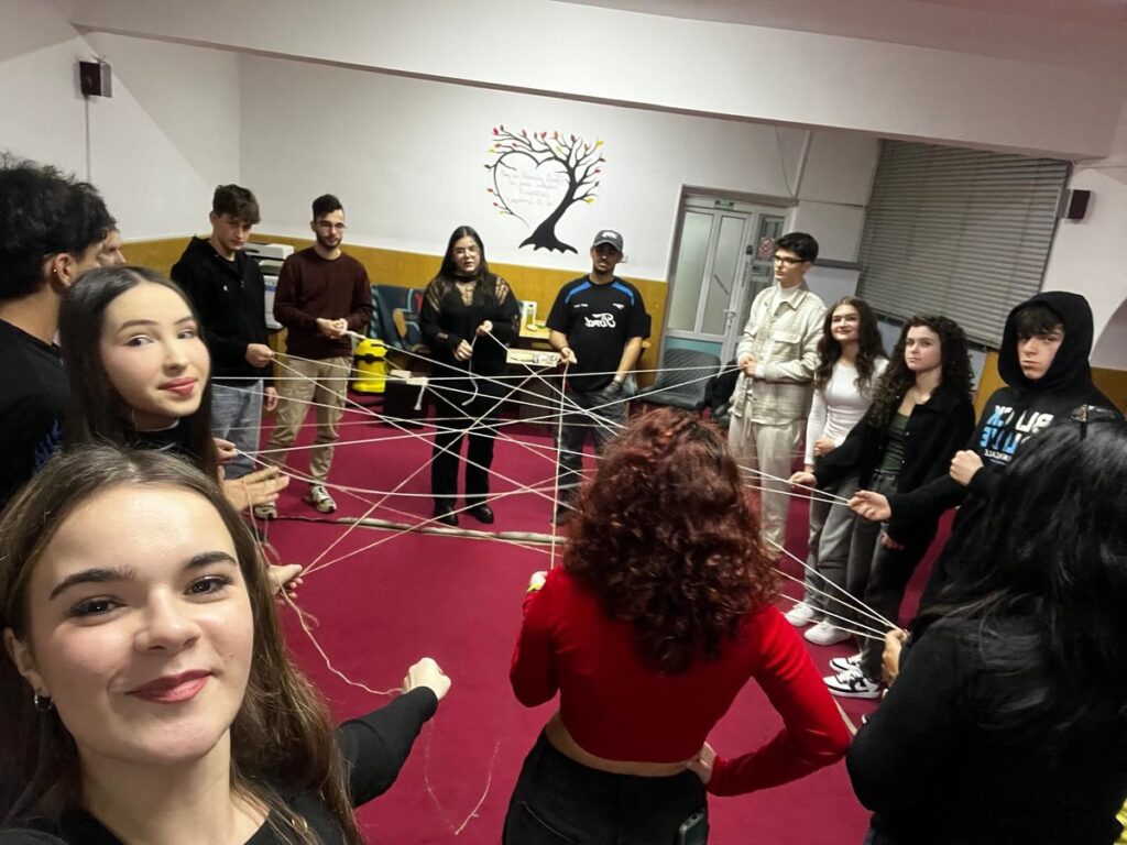 Din fotografiile activității se simte ideea de lucru împreună: un grup strâns într-un cerc, conectat prin fire ținute în mâini, ca o rețea care te obligă să fii atent la ceilalți, la spațiul dintre voi, la felul în care o mișcare se transmite mai departe. Imaginea nu spune totul, dar sugerează un lucru esențial pentru orice atelier pe teme sensibile: nu ești singur în exercițiu. Înveți în colectiv, te sprijini pe colectiv, îți verifici ideile prin colectiv.