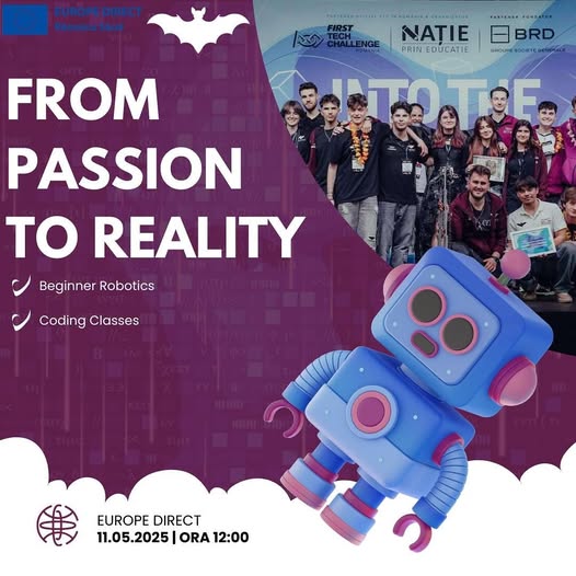 Există momente în care o idee mică, o întrebare pusă la timp sau o întâlnire cu oamenii potriviți îți poate schimba direcția. Uneori, pasiunea pentru tehnologie începe cu un simplu „Cum funcționează?” și crește, pas cu pas, până devine un proiect, o echipă, o reușită. Tocmai de aceea, duminică, 11 mai 2025, de la ora 12:00, la EUROPE DIRECT Râmnicu Sărat, organizăm evenimentul „From Passion to Reality”, o întâlnire care își propune să transforme interesul în experiență și entuziasmul în învățare aplicată.