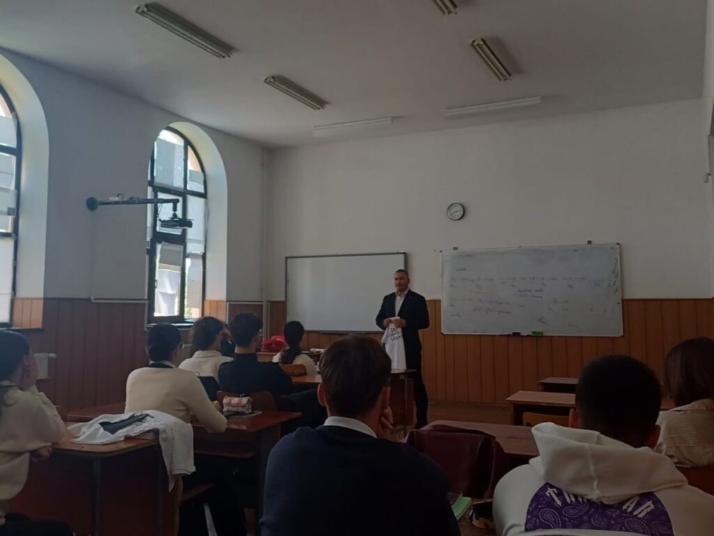 Din fotografiile care însoțesc postarea se vede atmosfera specifică unei întâlniri reale, nu a unei prezentări făcute „în gol”. Elevii stau la bănci, atenți, iar în fața clasei se află un vorbitor îmbrăcat la costum, în fața unei table. Nu e un cadru rigid sau distant: e acel tip de scenă în care școala devine un spațiu de dialog, iar întrebările au voie să fie puse fără să pară „în plus”. În a doua imagine, grupul se strânge pentru o fotografie de final, un detaliu care, fără să spună nimic în mod direct, sugerează un sentiment de „am fost împreună aici” și o întâlnire care a contat suficient cât să fie păstrată în memorie.
