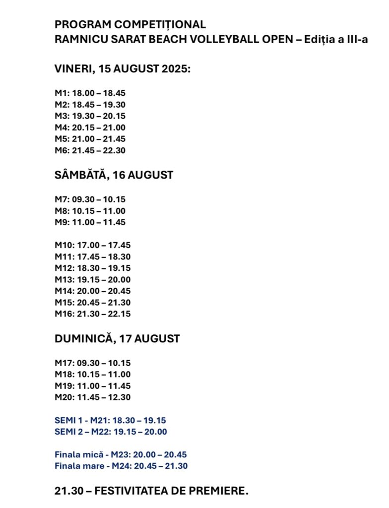 Indiferent dacă ești un cunoscător al regulilor de volei sau doar un trecător dornic de relaxare, meciurile din Parcul Municipal oferă o experiență autentică și plină de viață. Te așteptăm să fii parte din povestea acestei ediții și să îi susții pe tinerii lideri ai terenului de nisip. Viitorul sportului râmnicean se scrie cu fiecare punct marcat și cu fiecare spectator care alege să fie alături de campionii locali în aceste zile de vară pline de spectacol.